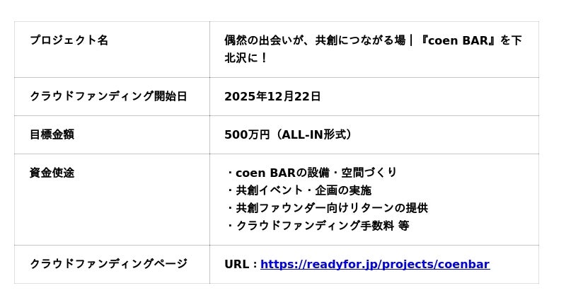 「ただの仕事場なら、つくらない。」共創が生まれ続けるBAR「coen BAR 下北沢」始動 ―― “一杯のドリンクから人生が動き出す場所”をつくるため、クラウドファンディングを開始