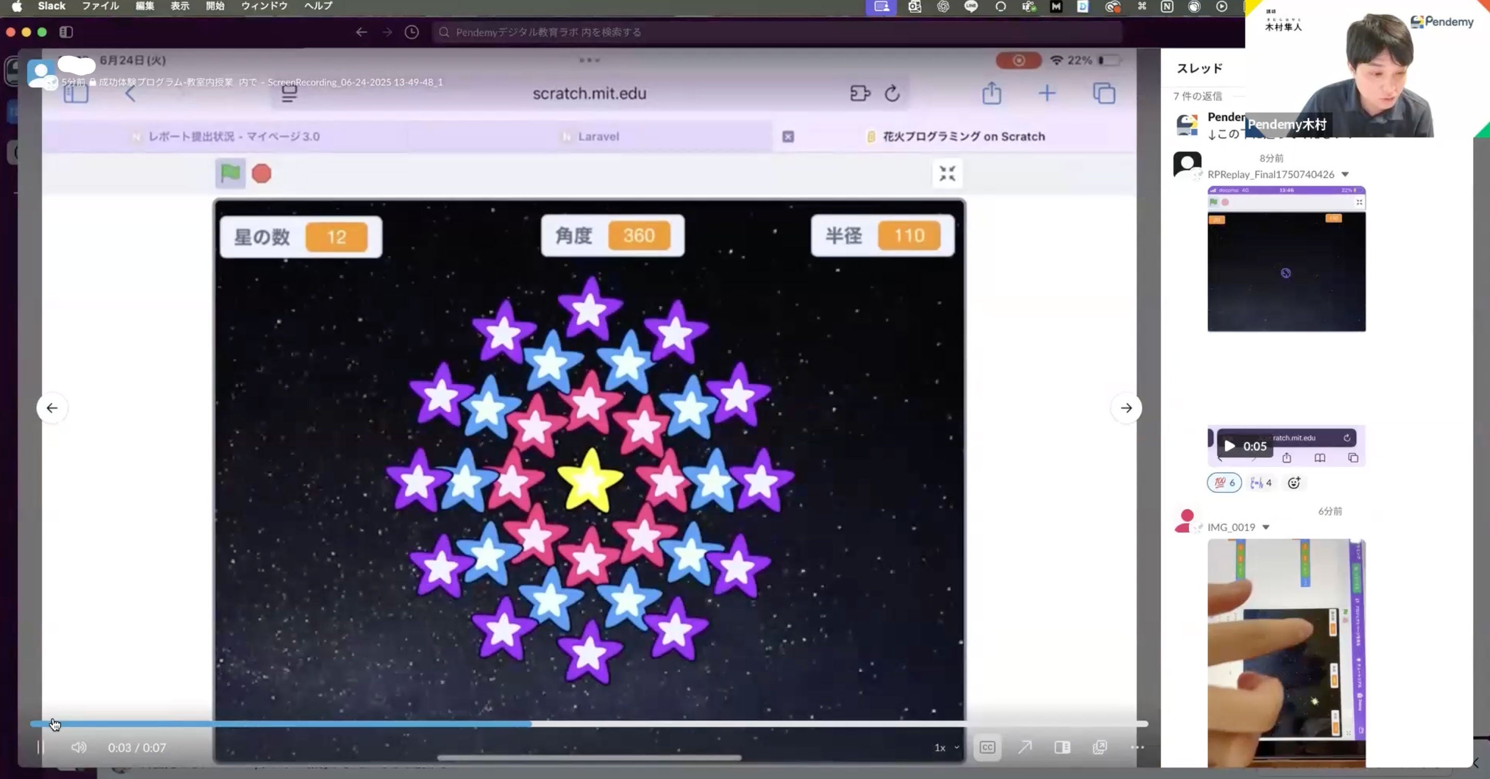 Scratchで星の配置を工夫しながら、オリジナルの花火プログラミングに挑戦する授業の様子