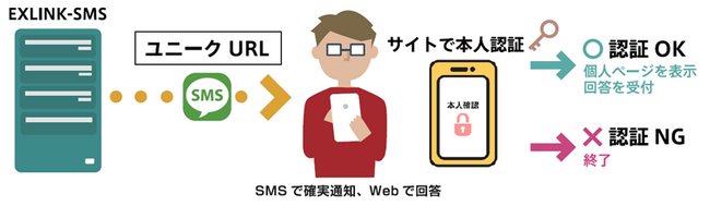 SMSを受信した対象者がサイトにアクセスする際、会員番号・誕生日・パスワード、その他の個人のみが知り得る属性情報を確認/入力することにより、複雑なユーザ操作が一切不用で「なりすまし」を防止し、安価且つ確実に本人確認を行い、回答受付ができるシステムです。