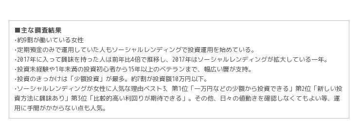 【ソーシャルレンディングに関する女性投資家の実態調査】利用者数は前年比4倍増、約9割が20代〜50代の働く女性