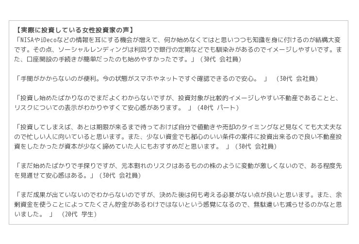 女性に人気な理由 第1位「一万円などの少額から投資できる」第2位「新しい投資方法に興味あり」第3位「比較的高い利回りが期待できる」