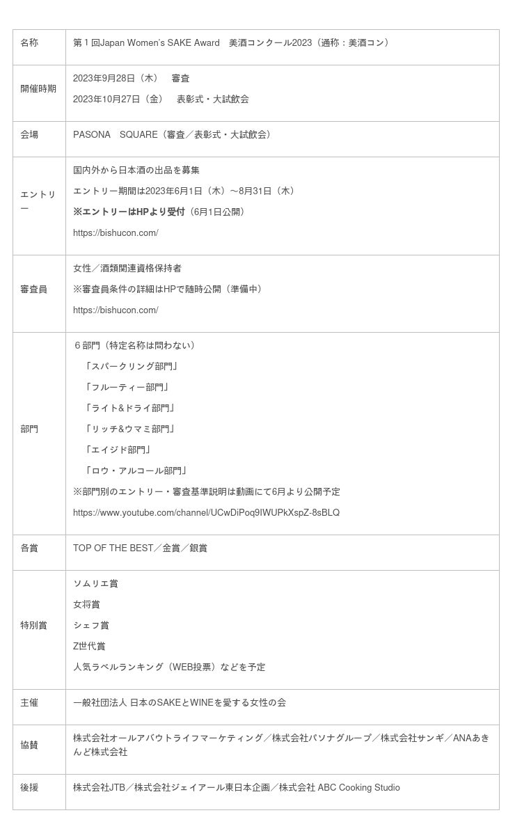 ※「国内初」の文言は、2023年5月の調査年月で、日本国内における日本酒コンクールに関して、 一般社団法人日本のSAKEとWINEを愛する女性の会調べにより記載しております。