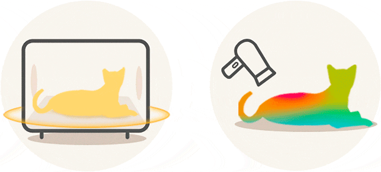 濡れたペットを、心地よい風で優しく静かにブローすることのできる、全自動のドライヤーハウスです。寒いときには温風で暖かく、暑いときには送風で心地よい、そのまま寝てしまうほどの快適さで、普段はハウスとしてくつろぐこともできます。