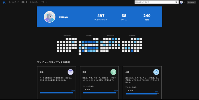 GitHubのContribution Graphのように、Recursion内の学習記録を残せるカレンダー機能を実装しました。日々の記録が残ることで学習のモチベーションを維持することができ、また就活の際には学習歴のアピールにも繋がります。日々の学習にぜひお役立てください。