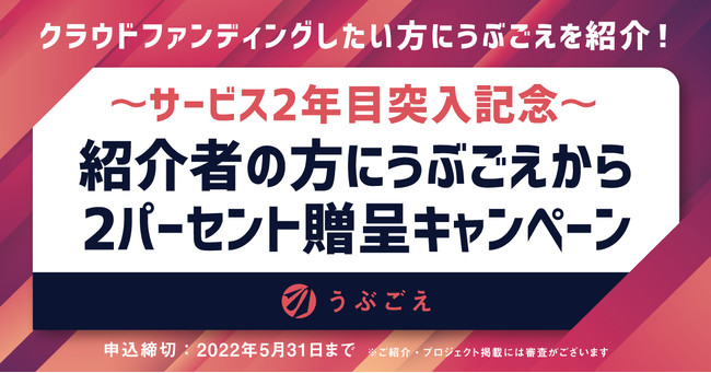 うぶごえ株式会社(本社:東京都渋谷区、代表:岡田一男)は、2022 年 2 月 25 日(金)より期間中の掲載プロジェクトをご紹介いただいた方へ、ご紹介から掲載されたプロジェクトで集まった総額の2%を紹介者様へ贈呈する「紹介者の方にうぶごえから2パーセント贈呈キャンペーン」を開始します。