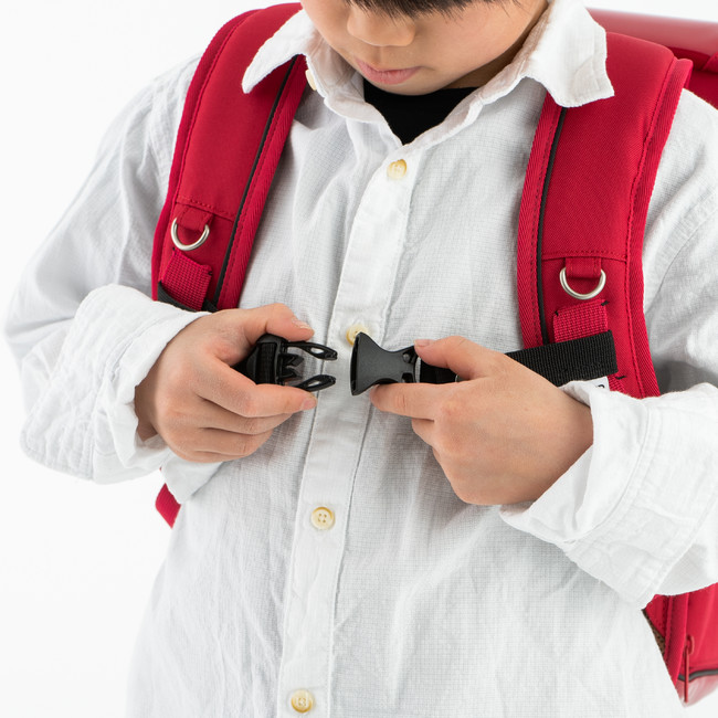 チェストベルトをつけるとスクールバックの身体へのフィット感がアップ。荷物が安定し、軽さを感じられます(※)。小柄なお子様にありがちな肩ひも(肩ベルト)のずれ落ちを防ぎます。