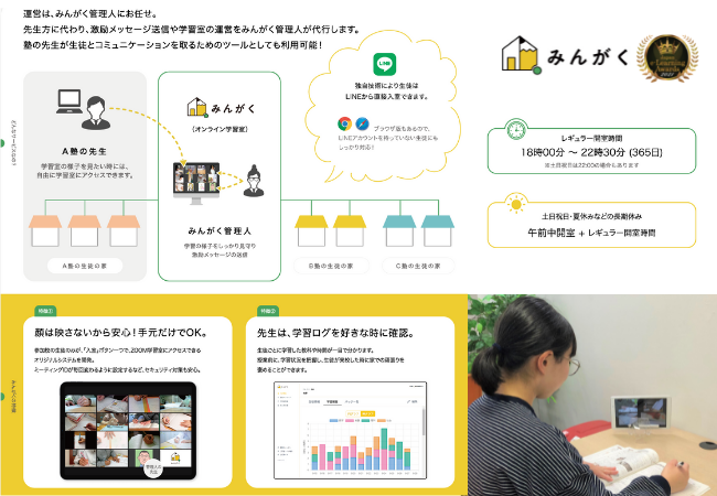 「みんがく」は、多くの塾が抱える「塾では勉強を頑張る生徒が、自宅に帰ると勉強しない」という悩みを解決するために立ち上がったプロジェクトです。全国の塾講師・塾経営者の協力による合同オンライン自習室から始まった業界初のサービスです。オンライン上にある学習室の開室時間(365日開室18時〜22時30分 ※土日祝・長期休暇は午前中も)には、管理人が常駐します。学習室に入室した生徒は、全国で頑張る仲間からの刺激と、管理人からの激励メッセージによりモチベーションを高め、緊張感を維持できることにより、家庭での学習が習慣化されるというしくみになっています。各塾の先生は、その学習記録をいつでも確認でき、ブラックボックスになってしまいがちな生徒の家庭学習を可視化することができるようになっています。このような新しい仕組みが評価され、昨年2021年には、文部科学省や経済産業省が後援する「日本e-Learning大賞」での特別部門賞、さらにはAES(Asia EdTech Summit)では、アジア太平洋地域のEdTech分野で目覚ましい成果を上げた企業を表彰するGold賞を受賞しました。このように有識者からもクオリティが評価されるようになってきたことから、本年より本格的な全国展開を予定しております。