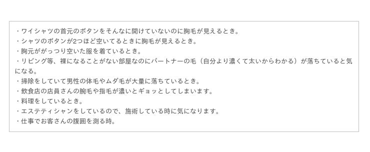 今回のアンケートで意外だったのは、男性のムダ毛に対して女性は否定的な意見が多いかと思いきや、男性だからそんなに気にしなくても良いという意見が男性よりも多かったことです。