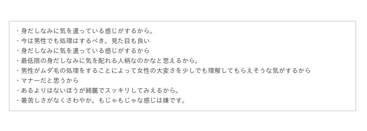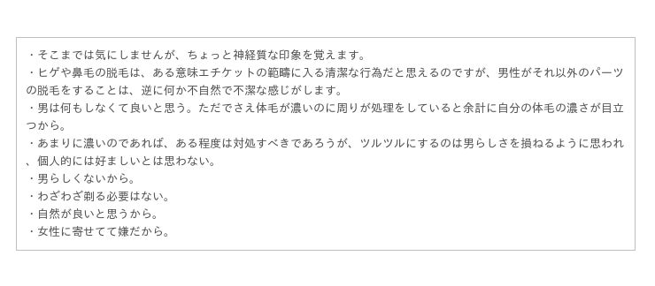 否定的な理由については、「女々しい」「男性らしくない」という意見があり、体毛があることが男性の象徴であるととらえている女性もいるということがわかります。