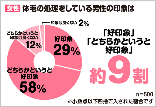 まず男性ですが、体毛の処理をしている人の印象についておよそ9割の人が好印象と答えています。良くないと答えている人は1割にも満たないので、同性がムダ毛処理をしていてもむしろ好感を持って見ていることがわかります。
