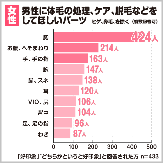 男性がムダ毛処理をすることに対して良い印象を持っている女性が、男性にケアして欲しいと思うパーツの1位は「胸」でした。
