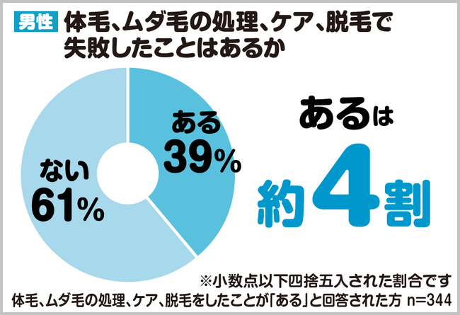 ではそのムダ毛処理で失敗したことがあるか聞いてみたところ、39%の人が「ある」と答えています。