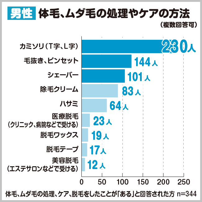 具体的にどのような方法で処理をしているのかについても聞きました。カミソリや毛抜き、シェーバーなど手軽でお金もかからない方法が多かったです。