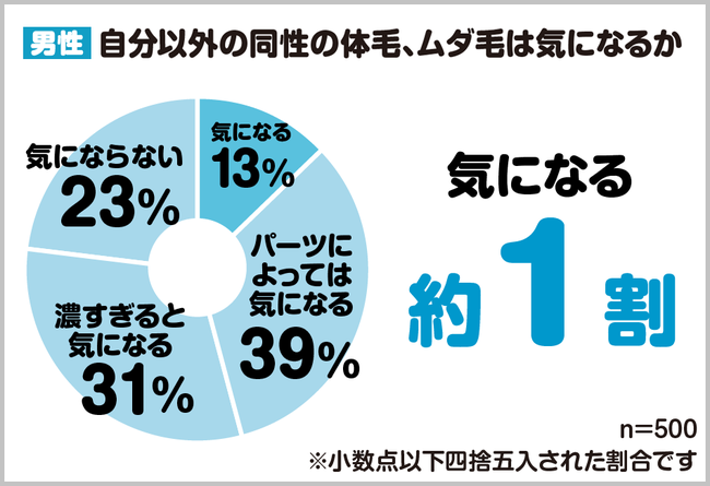 男性から見て、「同性(男性)のムダ毛は気になりますか?」という問いに対し、「気になる」は約1割となりました。