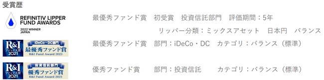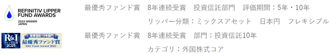 を測定いたします。評価対象となる分類ごとに、コンシスタント・リターンが最も高いファンドにリフィニティブ・リッパー・ファンド・アワードが贈られます。詳しい情報は、 lipperfundawards.com をご覧ください。 Refinitiv Lipper は、本資料に含まれるデータの正確性・信頼性を確保するよう合理的な努力をしていますが、それらの正確性については保証しません。 」