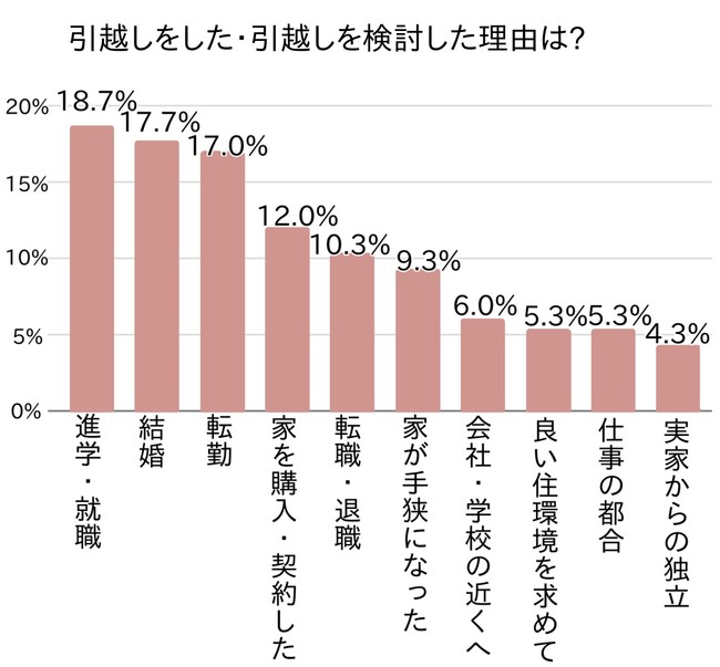 続いて、引越しをした・検討した理由を調査しました。トップは「進学・就職(18.7%)」で、地元を離れて進学・就職をするパターンが多く見られました。続いて「結婚(17.7%)」「転勤(17.0%)」での引越しが多く、このトップ3が僅差となりました。