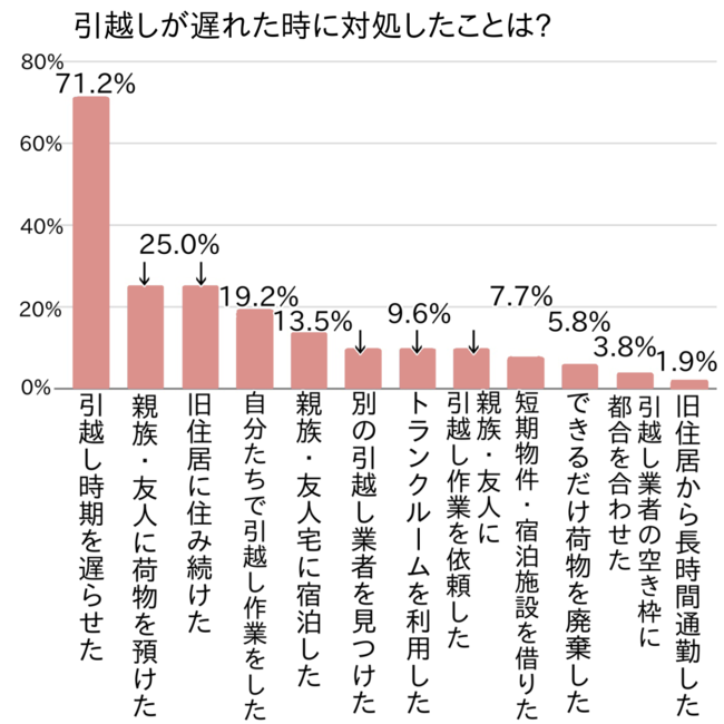 もちろん、うまくいかず、引越し待ち期間の家がない状態になる人も多数いました。その場合多かったのは「親族・友人に荷物を預けた(25.0%)」「親族・友人宅に宿泊した(13.5%)」パターンで、長期になると「短期物件・宿泊施設を借りた(7.7%)」ケースも多く見受けられました。