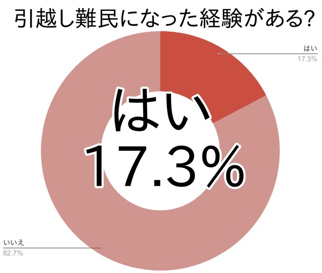 今回の調査では、スムーズに引越しできた人は82.7%はいるものの、「引越し難民」を経験した人は17.3%もいました。2割弱、5〜6人に1人という割合は、他人事ではなく誰にでも起こり得るものだと言えるでしょう。