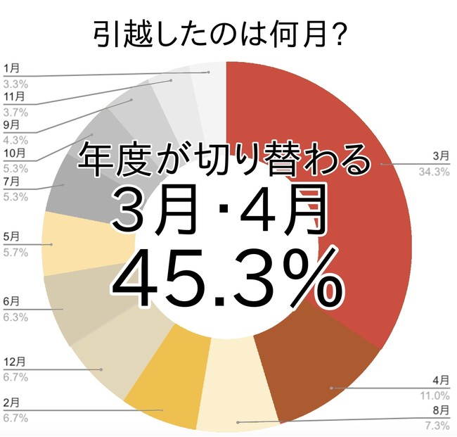 次に、引越しをした時期について調べました。圧倒的に多かったのは3月(34.3%)で、進学・就職・転勤等、新年度に始まる新生活に備えての引越しが多いことがわかりました。続いては同じく新年度に備えた4月(11.0%)で、3〜4月の年度切替時期だけで45.3%を占めることがわかりました。この結果を見るだけでも、3〜4月の引越し業者への依頼や物件探しが難航しそうだと想像がつきます。