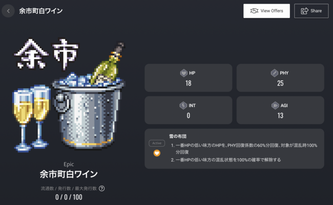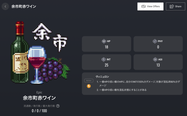 今回提供する返礼品は、ブロックチェーンゲーム「 My Crypto Heroes 」上で使えるNFTのアイテムです。寄付金額20万円の品が1種類20枚、寄付金額 3万円 の品が2種類各100枚ずつの合計220枚の品が提供されます。20枚限定の品は、マイクリの中でも最もレアなアイテムの一つで、ワイン樽モチーフに制作されています。各100枚限定の品は、余市町の名産品である赤ワインと白ワインをモチーフにしています。寄付者は、アイテムをお礼の品として受け取り、同ゲーム内で利用でき、味方の体力を回復させたり、敵を混乱状態にしたり様々な効果を得られます。