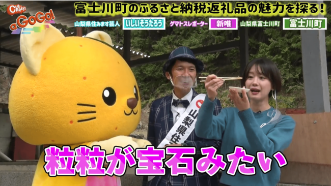 地域の名産品を新唯(あらたゆい・ミスSPA2022グランプリ)と、全国の“住みます芸人”が紹介する『ゲマトスグルメレポート』。12月1日(木)は富士川町在住の山梨県住みます芸人の「いしいそうたろう」をゲストに迎え、ご当地キャラの「ゆずにゃん」と富士川町のふるさと納税返礼品の魅力を探ります。