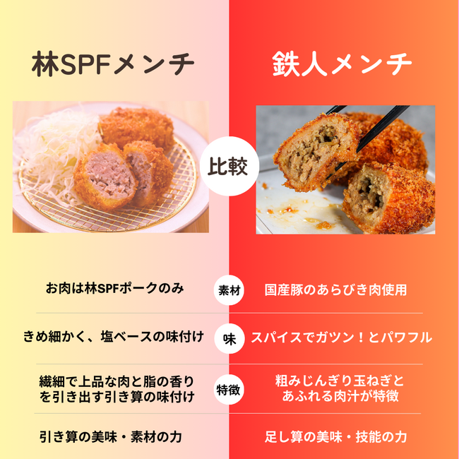 「肉とカレーのお店 マイティ」「からあげ とり多津」「自然薯の専門店 山薬清流庵」などを運営する株式会社エフアンドビー・プロジェクト(本社:東京都大田区/代表:織岡 陽一郎)は、メンチカツ専門店「メンチの鉄人」にて新商品「林SPFポーク100%使用のメンチカツ」「林SPFポークのロースカツ」を2023年9月30日から販売いたします。「メンチカツの、限界を超える。」をテーマに、おかず界におけるメンチカツの地位向上につなげる”ごちそうメンチカツ”です。肉だねは関東でも有数の銘柄豚である「林SPFポーク」を100%使用し他では味わうことのできないメンチカツ専門店ならではの贅沢な一品となっております。