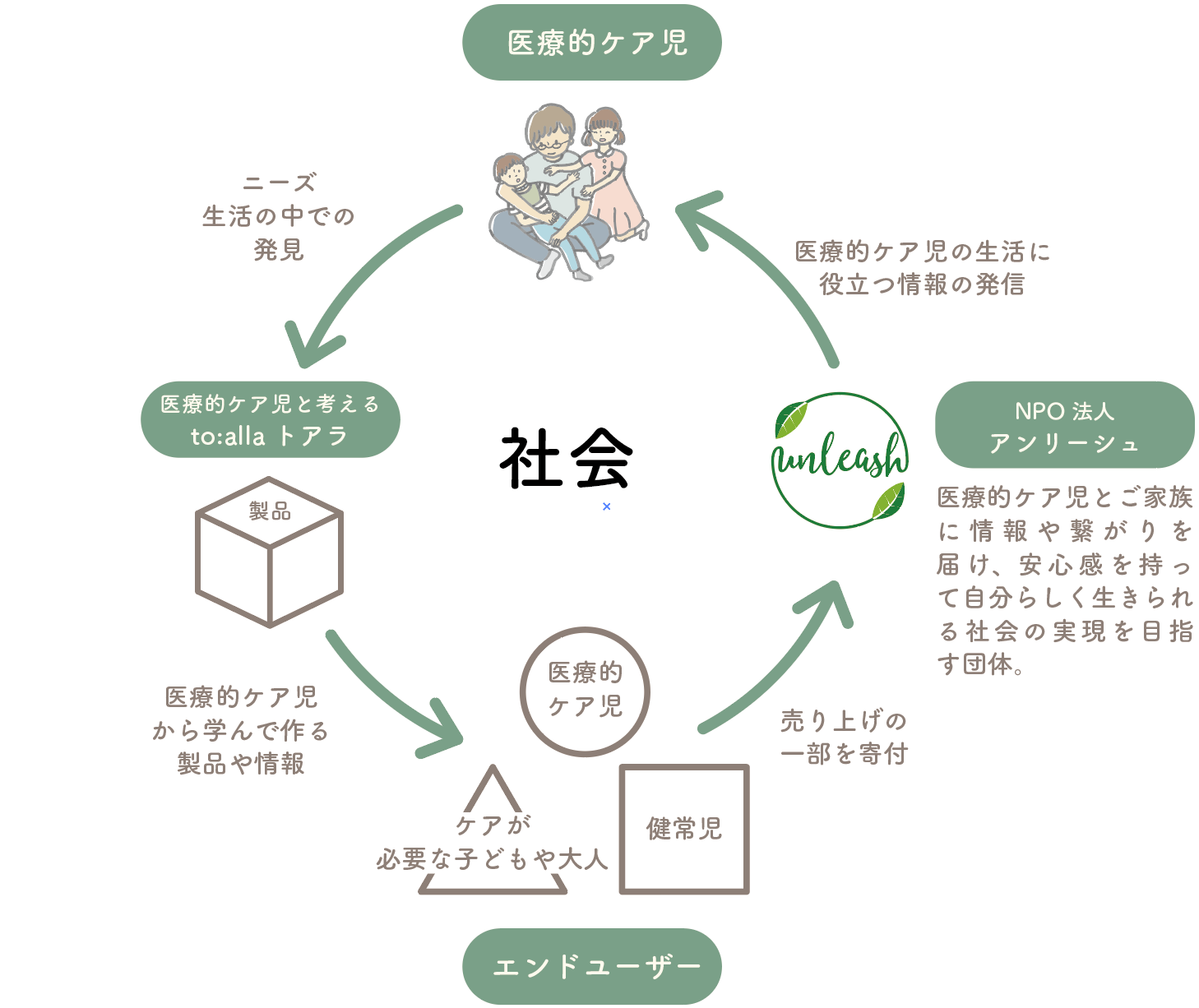 『to:alla(トアラ)』は医療的ケア児の生活の中での発見を軸に、医療的ケア児以外にもケアが必要な子どもや大人、健常児など、みんなが使いやすい製品を作り、その売上の一部をNPO法人アンリーシュに寄付しています。