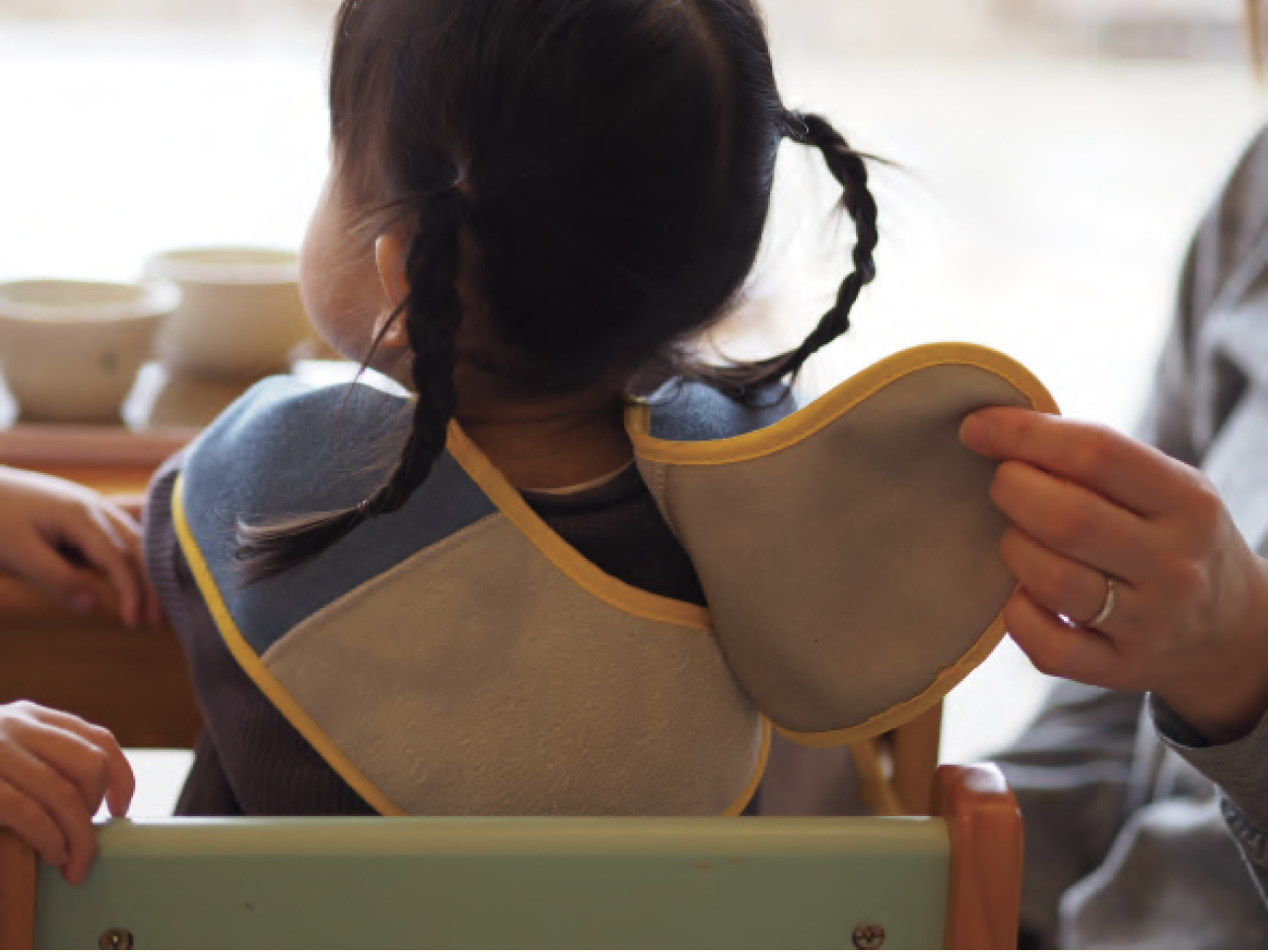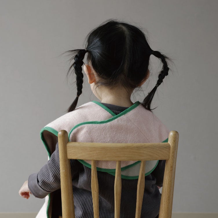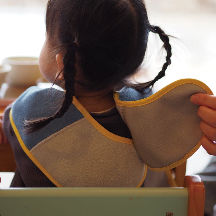 子どものケア中でも片手で簡単に取り外せ、汚れやすい肩周りまでカバーする横幅など、日常の負担を減らす工夫。