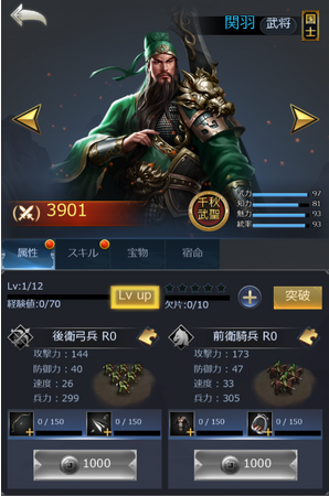 レベルを上げたり、武将の欠片を集めて突破させたりすることでより強力に!