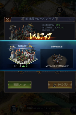 拠点には戦力を上げる施設や、武将の欠片を集める施設、様々な兵種を訓練できる施設など戦力に影響する重要なものばかり!