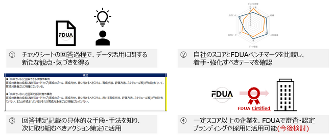 各金融機関で実施されたセルフチェック結果は、「FDUAベンチマーク」(*1)と比較することで、自社が強化すべき領域や分野を確認することができます。また、チェック項目や回答補足を参考にして、次に取り組むべきアクションを策定することができます。