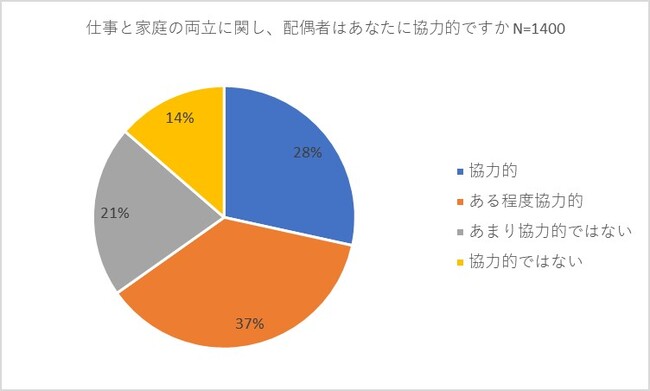 「仕事と家庭の両立に関し、配偶者はあなたに協力的ですか」との質問では、「ある程度協力的」との回答が37パーセントでトップ。「協力的」が28パーセントで続きました。「ある程度協力的」と「協力的」の合計は65パーセントとなり6割以上の夫が妻に協力的であることがわかりました。しかし、逆に言えば「あまり協力的ではない」と「協力的ではない」の合計も35パーセントに上り、3割以上の配偶者は協力的ではないと表現することもできるでしょう。