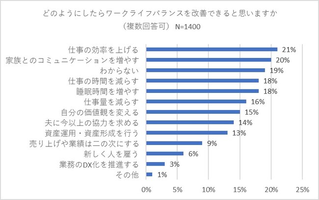 仕事に家事に忙しく、子育てや健康への不安もつきまとう女性経営者ですが、生活の質を改める必要があるでしょう。最後に「どのようにしたらワークライフバランスを改善できると思いますか」(複数回答可)と質問しました。「仕事の効率を上げる」との回答が21パーセントで最多となりましたが、上位にあまり差はなく「家族とのコミュニケーションを増やす」(20パーセント)、「わからない」(19パーセント)、「仕事の時間を減らす」(18パーセント)、「睡眠時間を増やす」(18パーセント)がそれぞれ続きました。