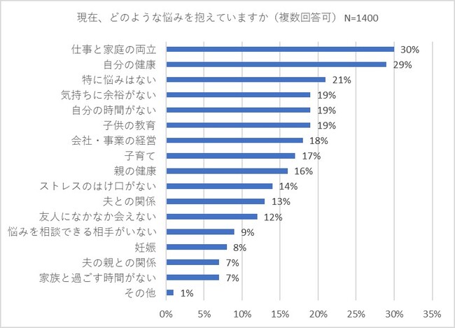 まず初めに「現在、どのような悩みを抱えていますか」と複数回答可で質問したところ、「仕事と家庭の両立」が30パーセントでトップとなりました。2位は僅差で「自分の健康」(29パーセント)でした。その後はやや差が開いて「特に悩みはない」が21パーセント、「気持ちに余裕がない」、「自分の時間がない」、「子供の教育」がいずれも19パーセントで続きました。