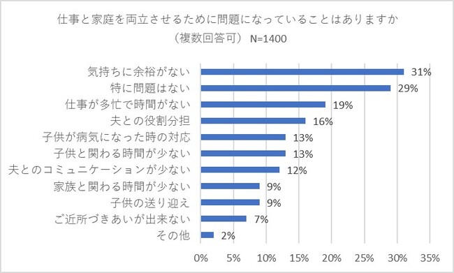 また、「仕事と家庭を両立するために問題になっていることはありますか」(複数回答)と聞いたところ、「気持ちに余裕がない」が31パーセントで最も多くの回答を集めましたが、「特に問題ない」(29パーセント)との回答もほぼ同じ割合で集まりました。それ以外では「仕事が多忙で時間がない」(19パーセント)、「夫との役割分担」(16パーセント)、「子供が病気になった時の対応」と「子供と関わる時間が少ない」(ともに13パーセント)が続きました。