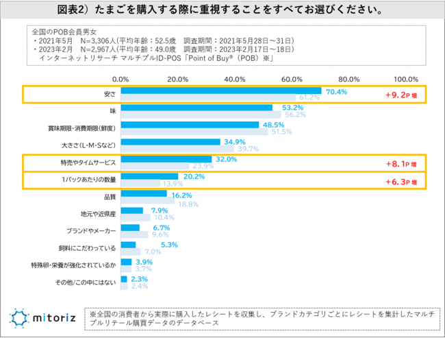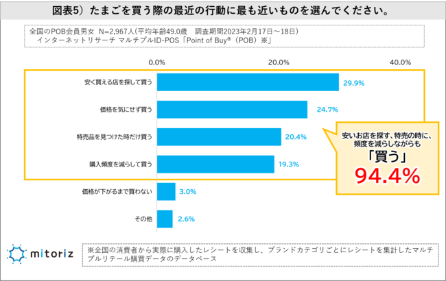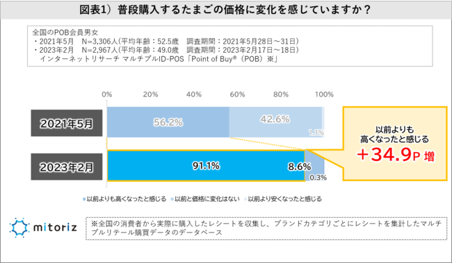 株式会社mitoriz(本社:東京都港区、代表取締役社長:木名瀬博)は、消費者購買行動レポートデータサービス「Point of Buy(R)(以下、POB)」の会員2,967人に「たまごの値上げに関する調査」を実施致しました。