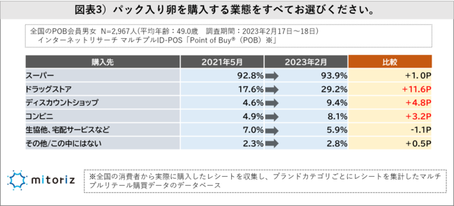 「たまごを購入する業態」について尋ねたところ、最も多い購入先は「スーパー(93.9%)」したが、前回と比較すると、「ドラッグストア(+11.6P)」、「ディスカウントショップ(+4.8P)」、「コンビニ(+3.2P)」などの食品スーパー以外の業態の購入比率が伸長しており、購入先は以前よりも多様化しているようです(図表3)。なかでもドラッグストアは前回調査の1.6倍超となる30%近い割合となっており、ドラッグストアを利用する人が増えていることがわかります。