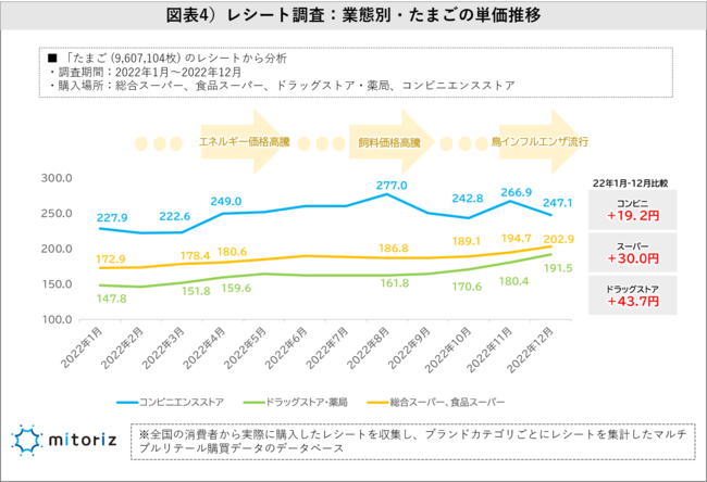 さらにレシートデータ(POBデータ)から分析し、たまごの単価推移を「コンビニ」「スーパー」「ドラッグストア」の3業態で比較したところ、全体的には値上がりをしているものの、平均単価が最も安いのはドラッグストアという結果となりました(図表4)。「価格」を重視する人が増加傾向にある中で、たまごを安価で購入できる点が、ドラッグストアが購入先として伸長した一因と考えられます。