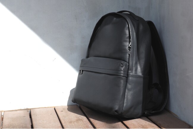 革本来の質感と素材感を保ちつつ、半永久的に防水効果が持続する特殊な素材を使用したリュック。