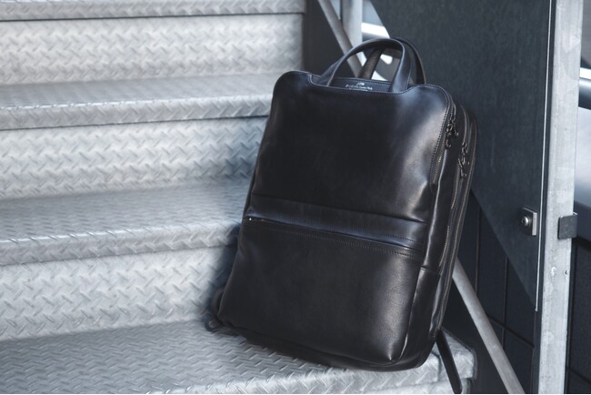 上記のカジュアルリュックと同様の防水レザーを使用したビジネス仕様のリュック。書類やPCを雨から守ります。シンプルなスクエア型で、メインルーム以外に、PC・書類収納ポケット、ガジェット収納に適したポケット、セキュリティに優れたポケットとそれぞれ独立した4つのコンパートメントで用途別に仕分け収納が可能です。