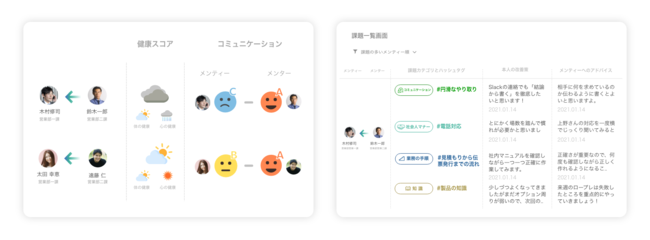 新入社員、メンターが回答した内容はダッシュボード画面上で集計され、新入社員の健康状態やメンターとのコミュニケーションのギャップ、抱えている課題と解決に取り組んでいる状況をダッシュボードで見える化します。