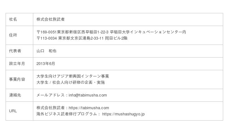 株式会社旅武者(本社:東京都新宿区、代表取締役:山口和也、以下「当社」)が運営する、参加学生数No.1の海外インターンシップ*「海外ビジネス武者修行プログラム」は、立教大学グローバル教育センターとの連携により、2018年度から立教大学の正課科目(単位取得対象科目)の 認定コースとなりました。当社は、5年超にわたるビジネス人材育成プログラムの継続的な提供経験を活かし、グローバルビジネス人材の育成支援などにおいて、教育機関との外部連携を強化していきます。