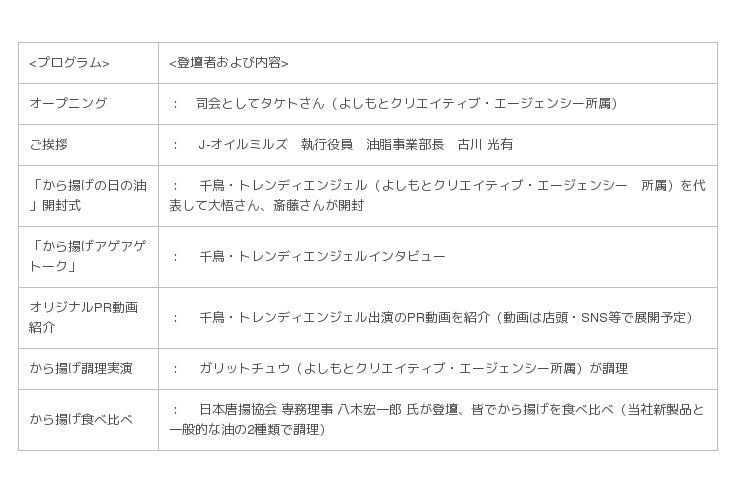 株式会社J-オイルミルズ(東京都中央区、資本金100億円、代表取締役社長:八馬史尚)は株式会社よしもとクリエイティブ・エージェンシー(社長:藤原寛 本部:東京都新宿区)に所属する千鳥、トレンディエンジェルを「からあげの日の油」のPRアンバサダーとして起用し、2019年3月よりPR動画を店頭やSNSで配信します。