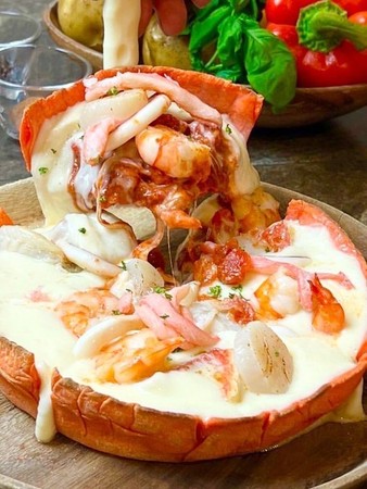 シーフードカレーシカゴピザは、オリジナルブレンドチーズとトマトカレーをピザ生地に流し込み、海老、カニ、ホタテ、白身魚、イカの5種の海鮮を贅沢にトッピングしたボリューム満点の一品に仕上がっています