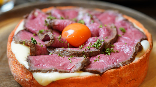 ローストビーフの上にある卵黄を崩せば、インスタ映え必須!