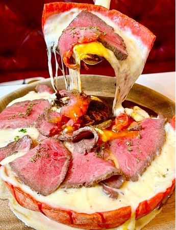 自家製のキーマカレーを濃厚チーズの下にたっぷり敷き詰めており、柔らかいローストビーフで蓋をした進化系シカゴピザ!