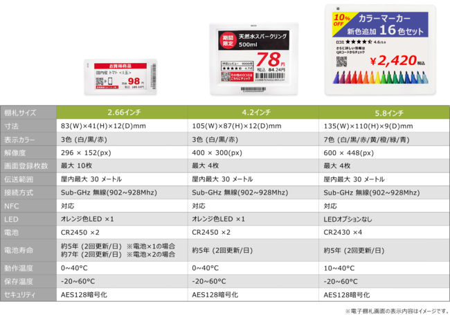 3色の2.66インチ、4.2インチサイズの他、5.8インチサイズには7色の電子ペーパーを採用し、従来の値札用途だけではなく、写真の表示やカラフルさで視覚に訴える販促など、広い用途へ活用頂くことが出来ます。