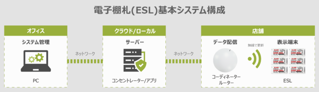 電子棚札(Electric Shelf Label, ESL)は、従来の紙の棚札の価格やラベルなどの表示をデジタル化するソリューションです。価格や情報を管理しているデータベース、販売管理システムなどと連携させ、棚札の書き換えを無線で実施することにより、時間と人員の必要だった更新作業を効率化できコスト削減できるだけではなく、タイムリーな価格変更、情報表示により効果的な販促が可能となります。