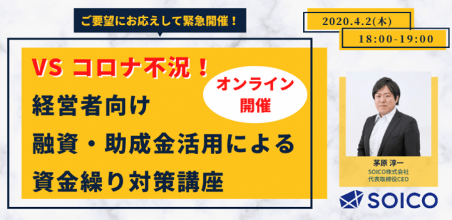 サービス開始に先駆け、先日4月2日に「【VSコロナ不況】経営者向け、融資・助成金活用による資金繰り対策講座」を開催致しました(完全オンライン開催)。