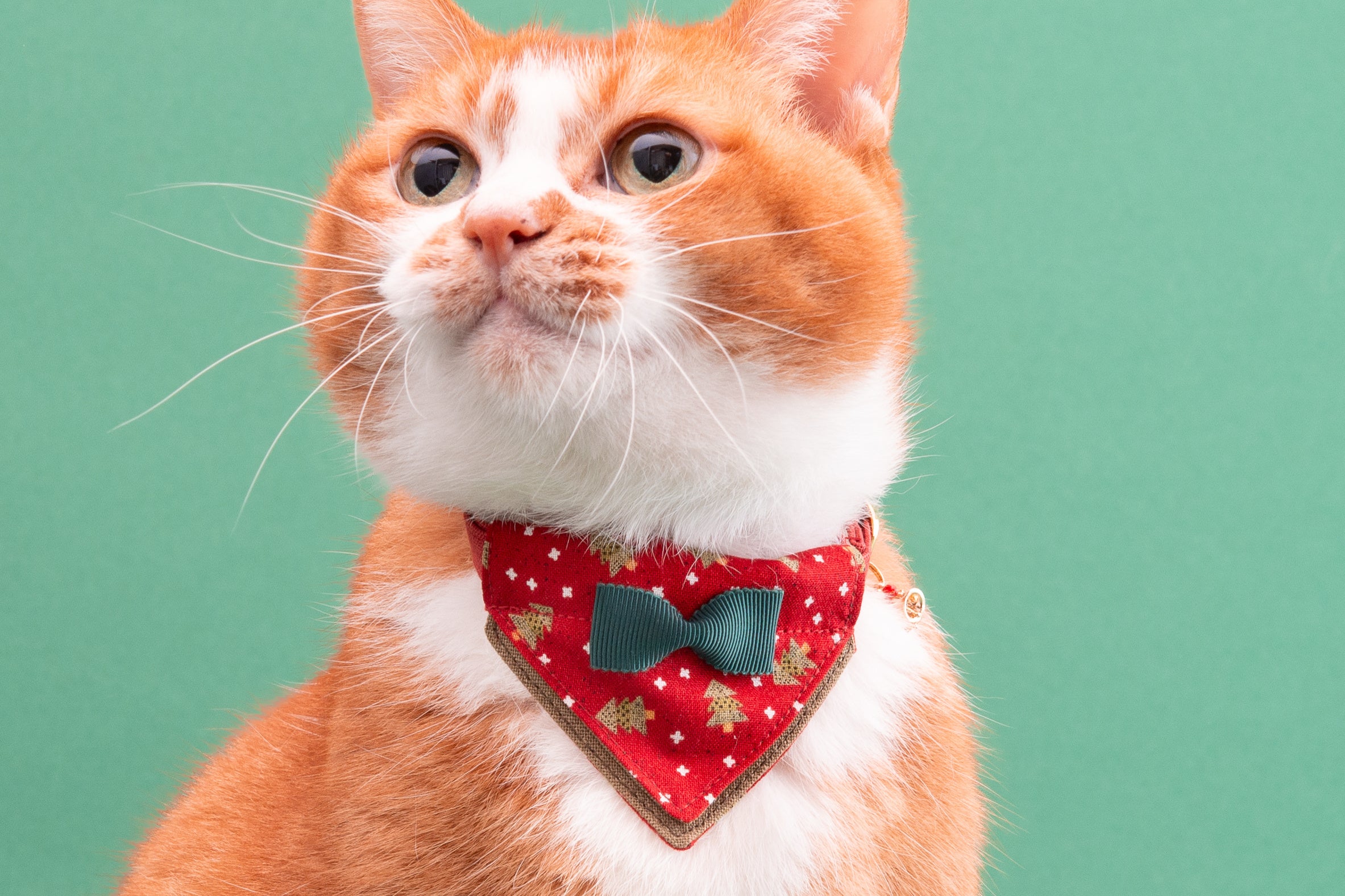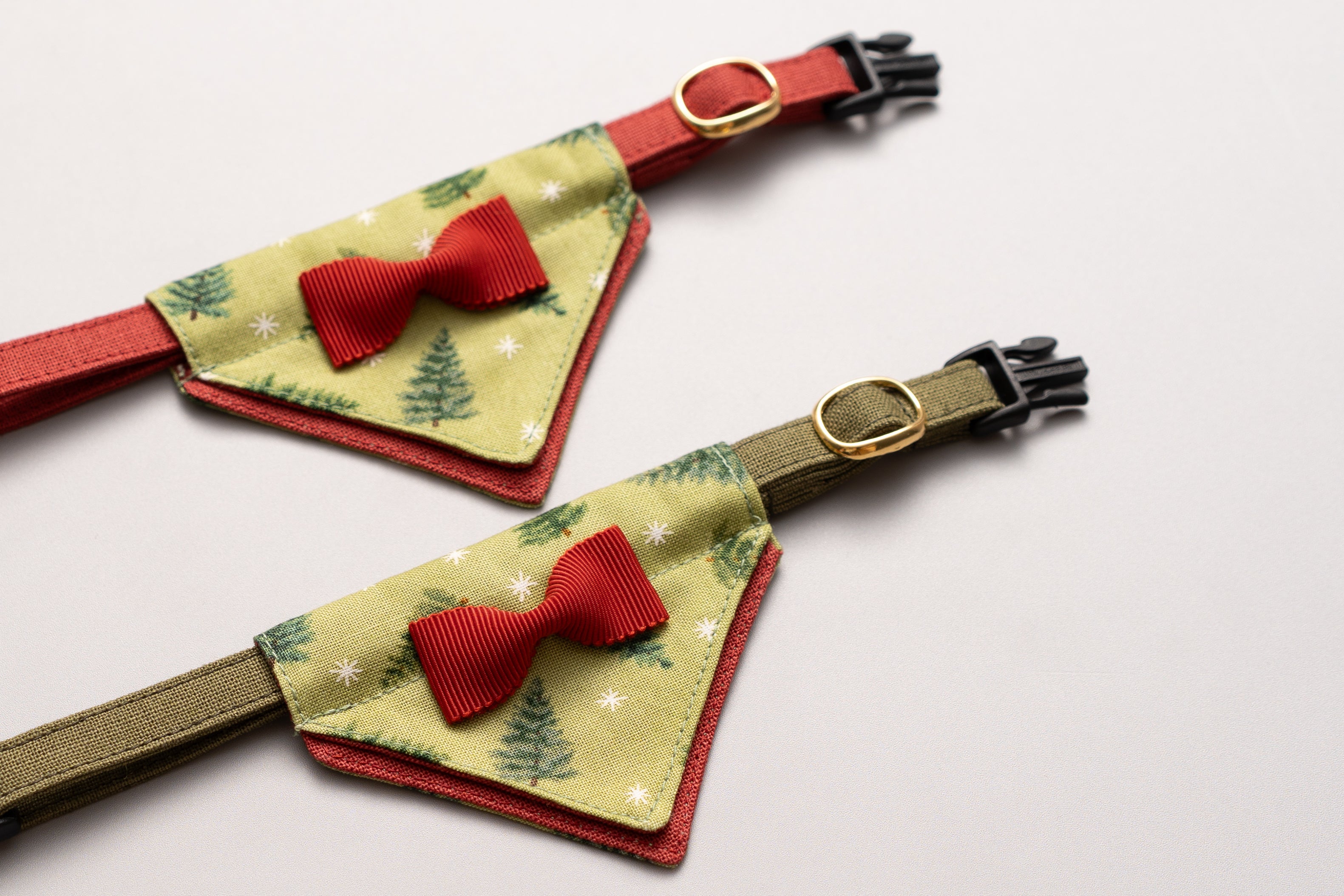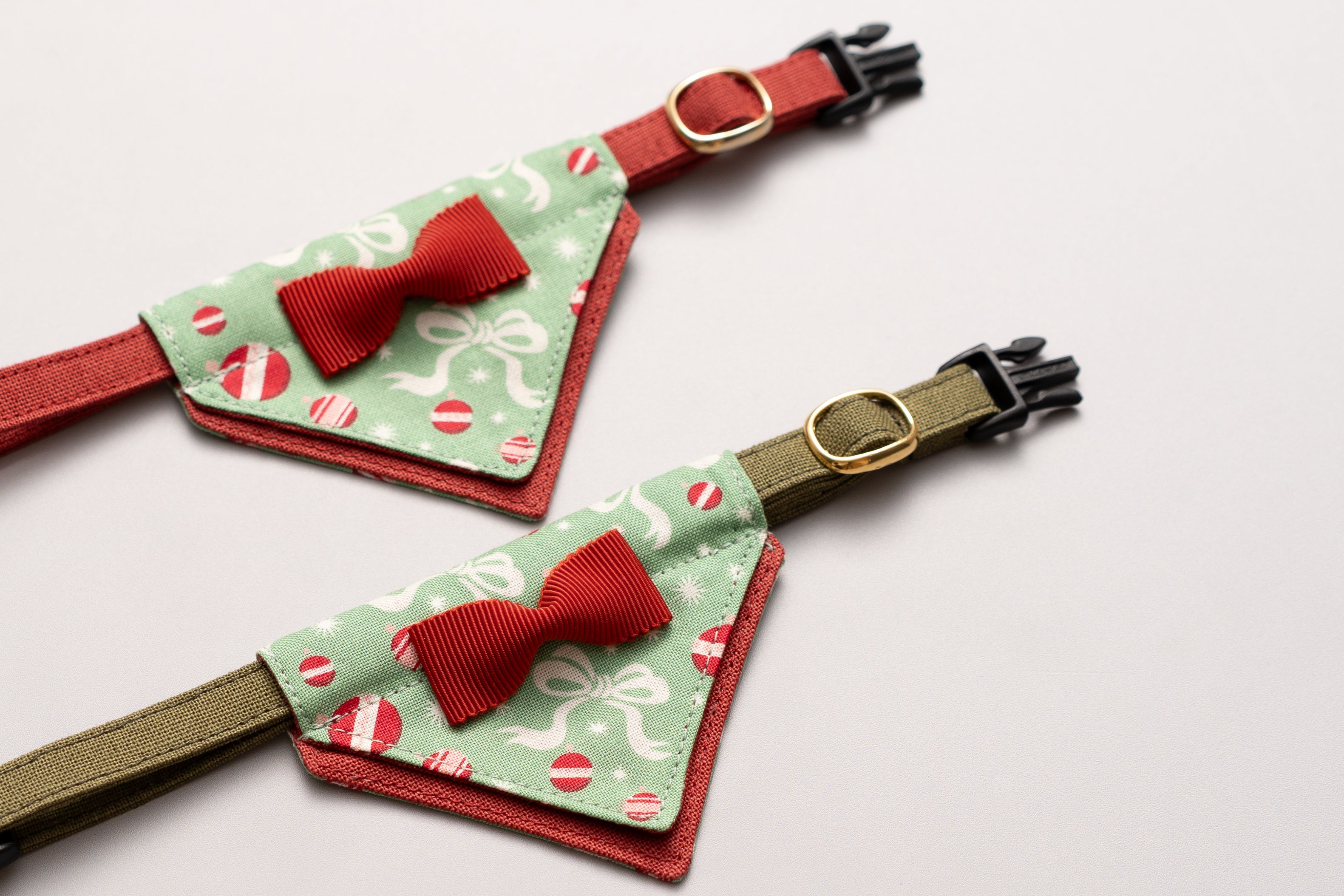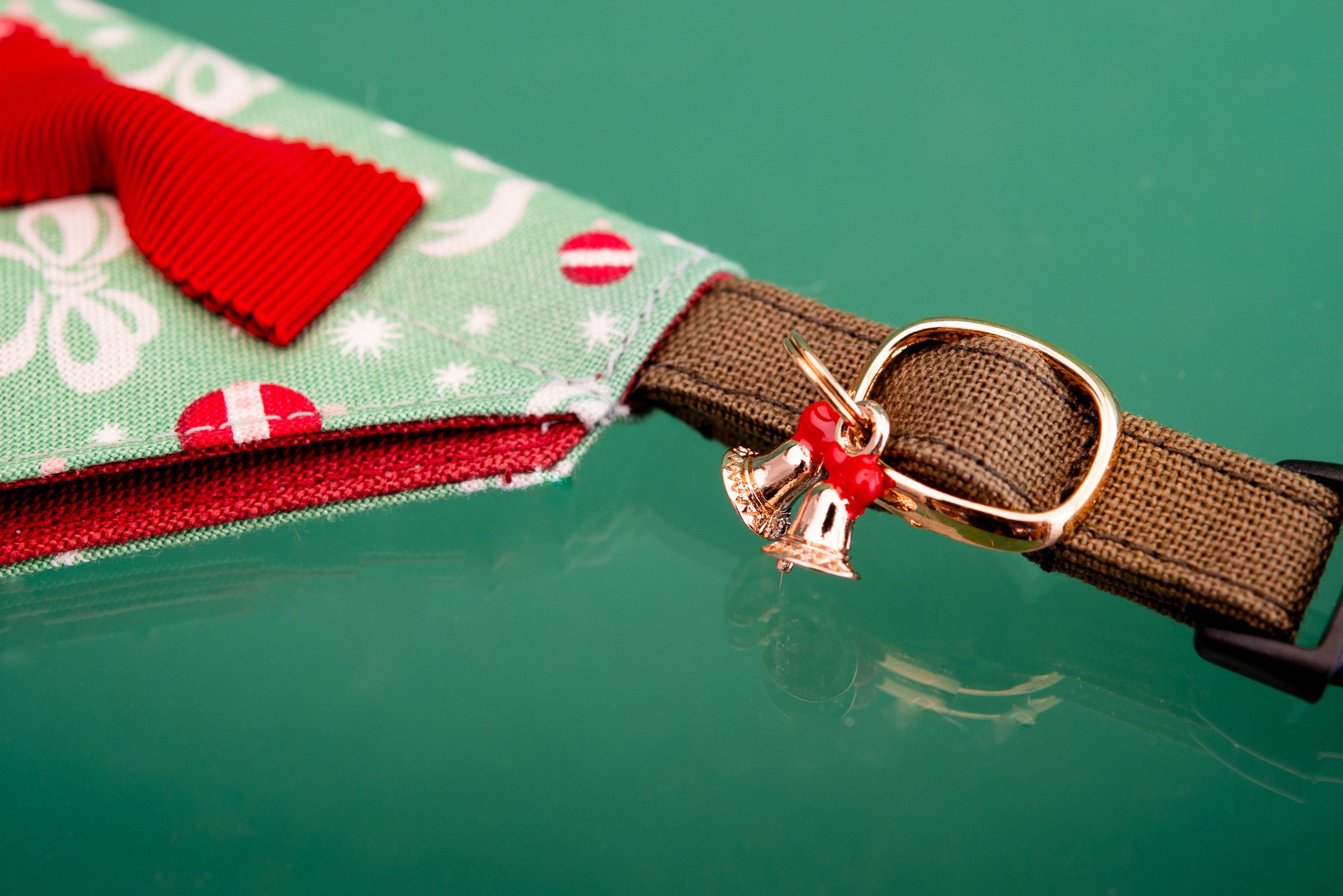 クリスマスのワンシーンにそっと寄り添う、猫にやさしい猫首輪です。